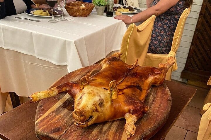 Gastronomic Menu includes: La Granja White beans plus Roasted suckling pig plus Punch cake with ice cream plus Wine, mineral water and coffee